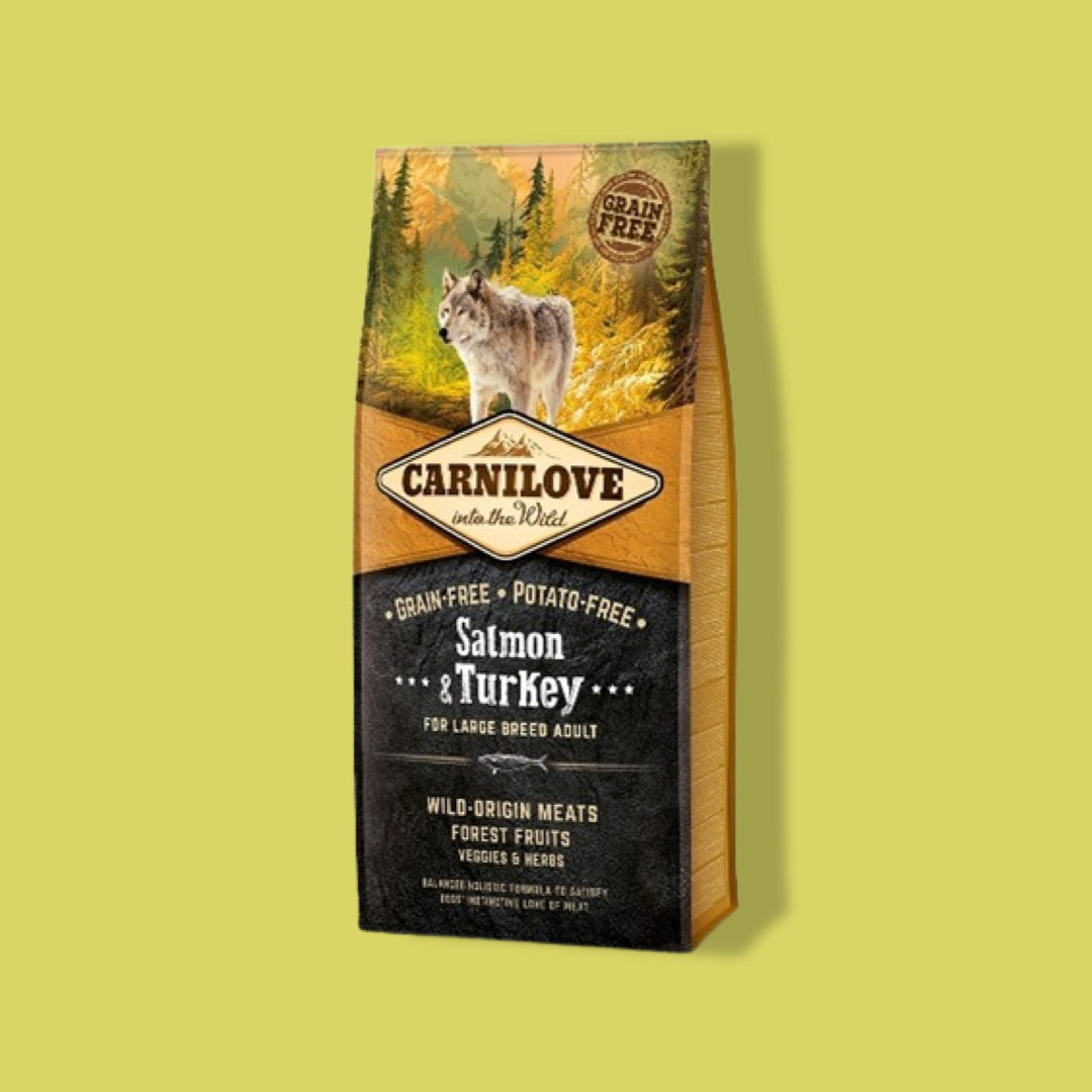 Carnilove Salmon Turkey Adult Large Breed is graanvrij, kwalitatief hoogwaardig hondenvoer voor honden met zalm en kalkoen, aansluitend bij de natuurlijke voedingsbehoefte van grote hondenrassen. D..... Lees omschrijving »