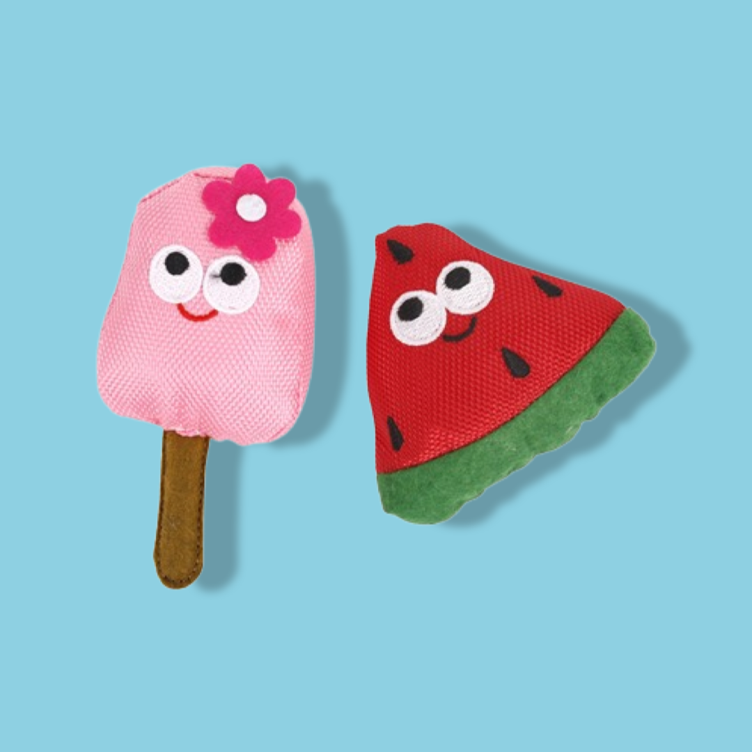 De Fofos Summer Watermeloen Met Ijsje is zomers kattenspeelgoed met kattenkruid. Dit setje bestaat uit twee kattenspeeltjes, een watermeloenpunt en een ijsje, met vrolijke gezichtjes. Het ijsje is ..... Lees omschrijving »