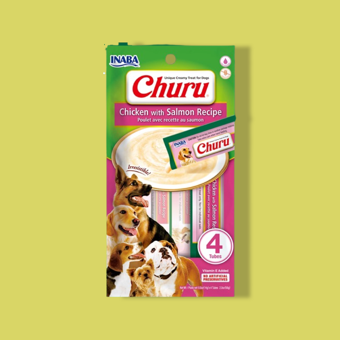 Oelalaa, wat lekkurr! De Inaba Churu Chicken Salmon is een romige aanvullende hondensnack van crème, rijk aan vocht en graanvrij. Honden vinden het heerlijk om lekkernijen op te likken. Likken is e..... Lees omschrijving »