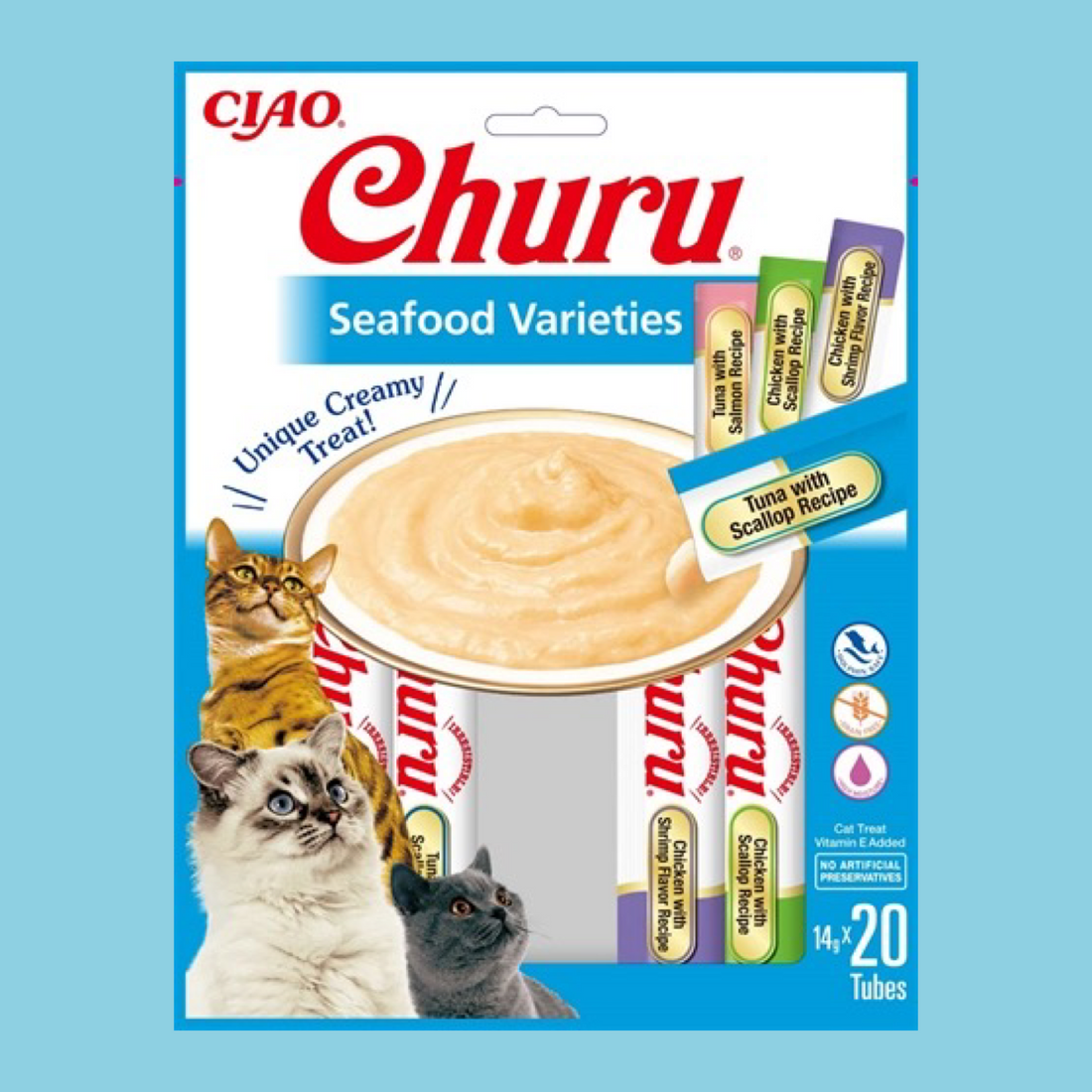 Inaba Churu Multipack Seafood 20X14 gram is een romige aanvullende kattensnack van crème, rijk aan vocht en graanvrij. Katten hebben vaak de neiging om te weinig te drinken, wat tot dehydratatie ka..... Lees omschrijving »