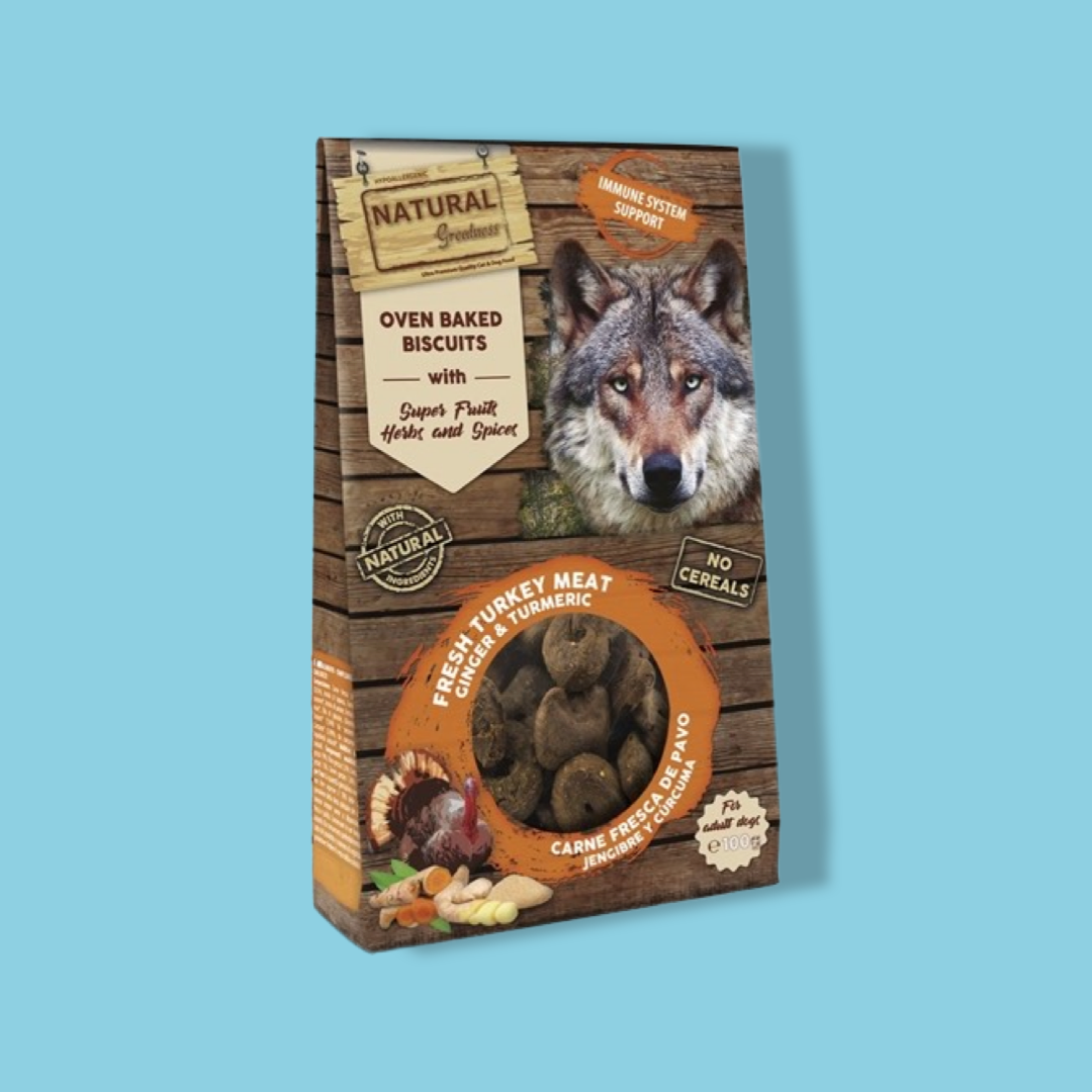 De Natural Greatness Gebakken Koekjes 100 gr hondensnack zijn graanvrij en hypoallergene hondenkoekjes met vers kalkoenvlees, gember en kurkuma die het immuunsysteem ondersteunen. Verwen jouw hond ..... Lees omschrijving »