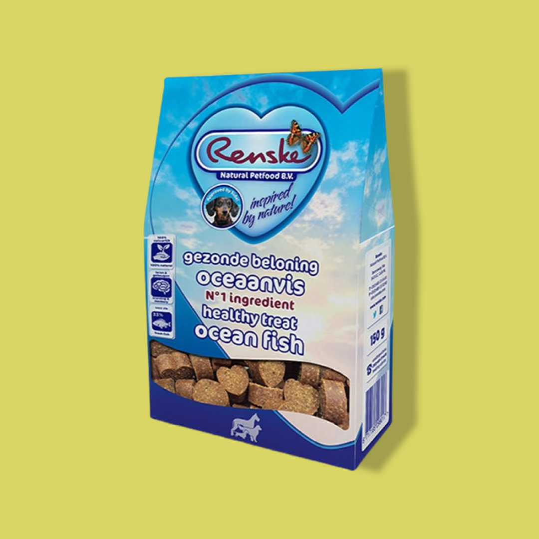 Renske Gezonde Beloning met oceaanvis is aanvullend diervoer voor de hond. Het is een zeer smakelijke en gezonde beloning! Deze glutenvrije beloning heeft als hoofdingrediënt vis. Verkrijgbaar in ..... Lees omschrijving »